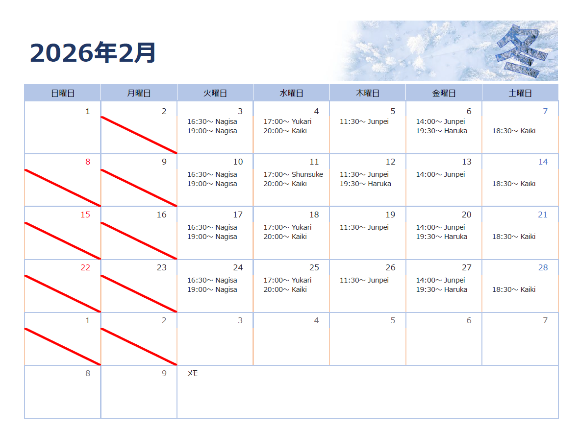 2月 グループレッスンの日程表