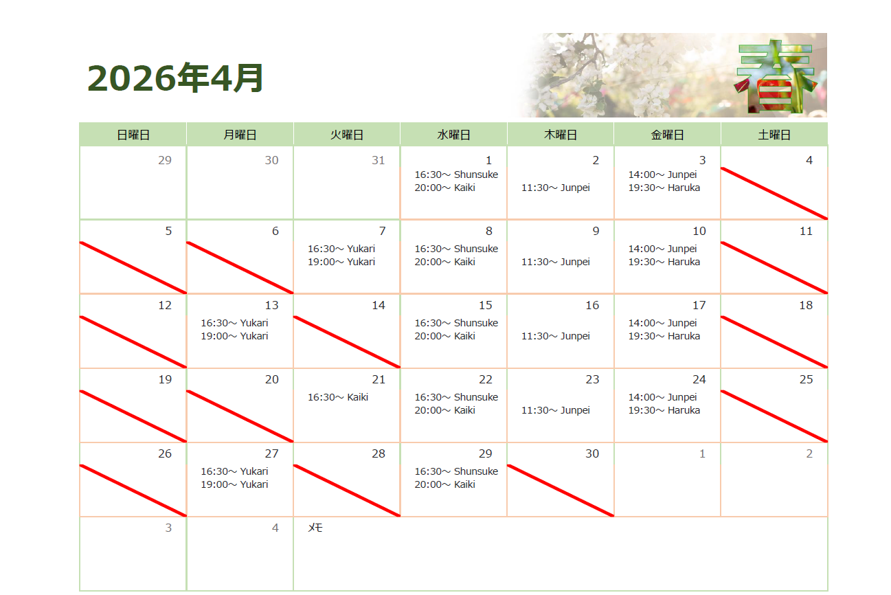 4月 グループレッスンの日程表